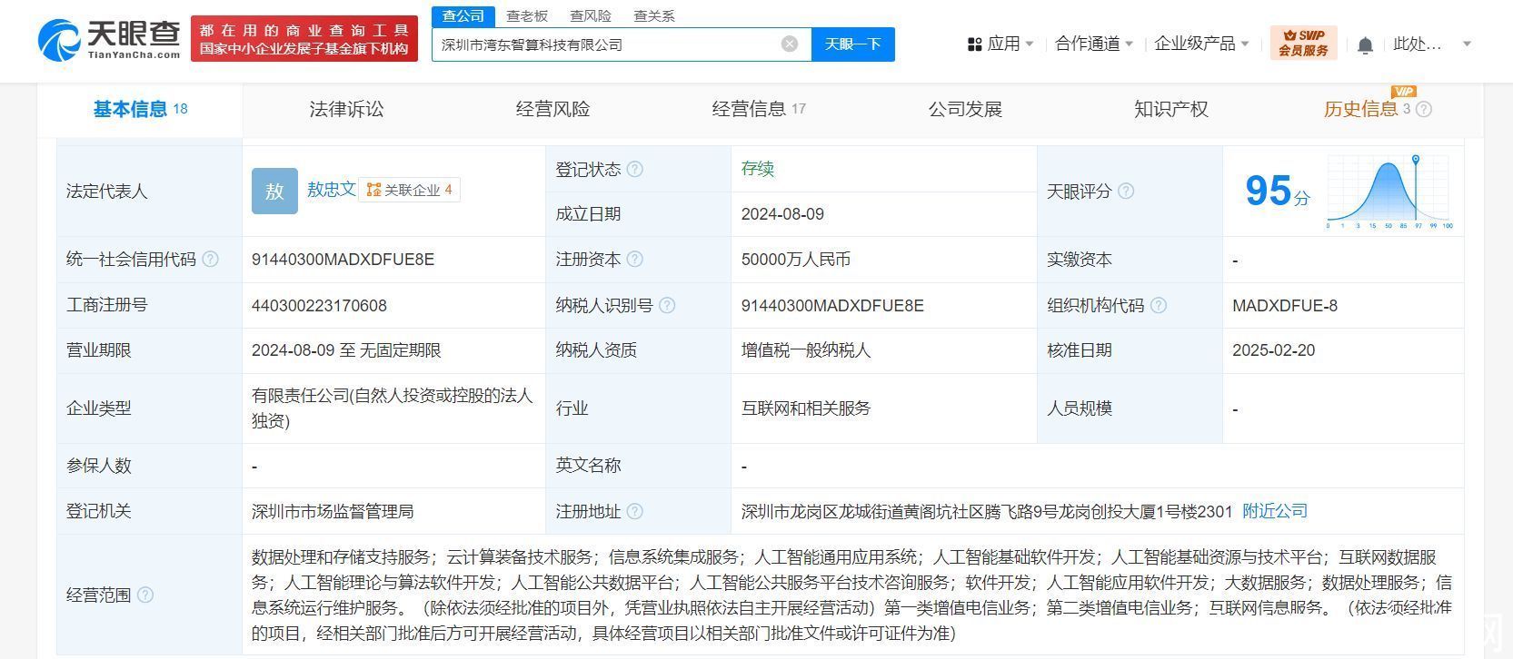 深圳市湾东智算科技有限公司成立于2024年8月,法定代表人为敖忠文,经营范围含数据处理和存储支持服务、云计算装备技术服务、信息系统集成服务、人工智能通用应用系统、人工智能基础软件开发、人工智能基础资源与技术平台、互联网数据服务等。股东信息显示,该公司由深圳市龙岗区城市建设投资集团有限公司全资持股。