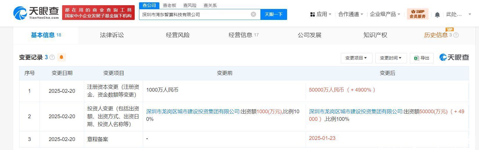 天眼查App显示,近日,深圳市湾东智算科技有限公司发生工商变更,注册资本由1000万人民币增至5亿人民币,增幅4900%。